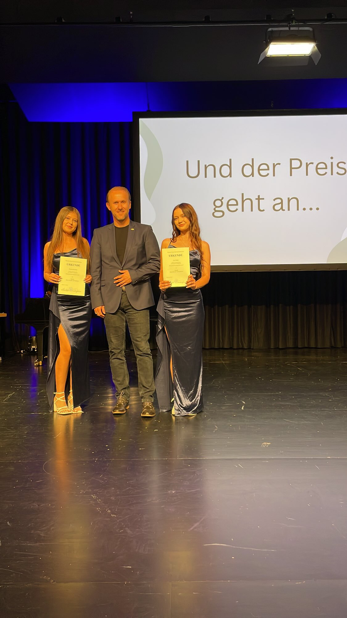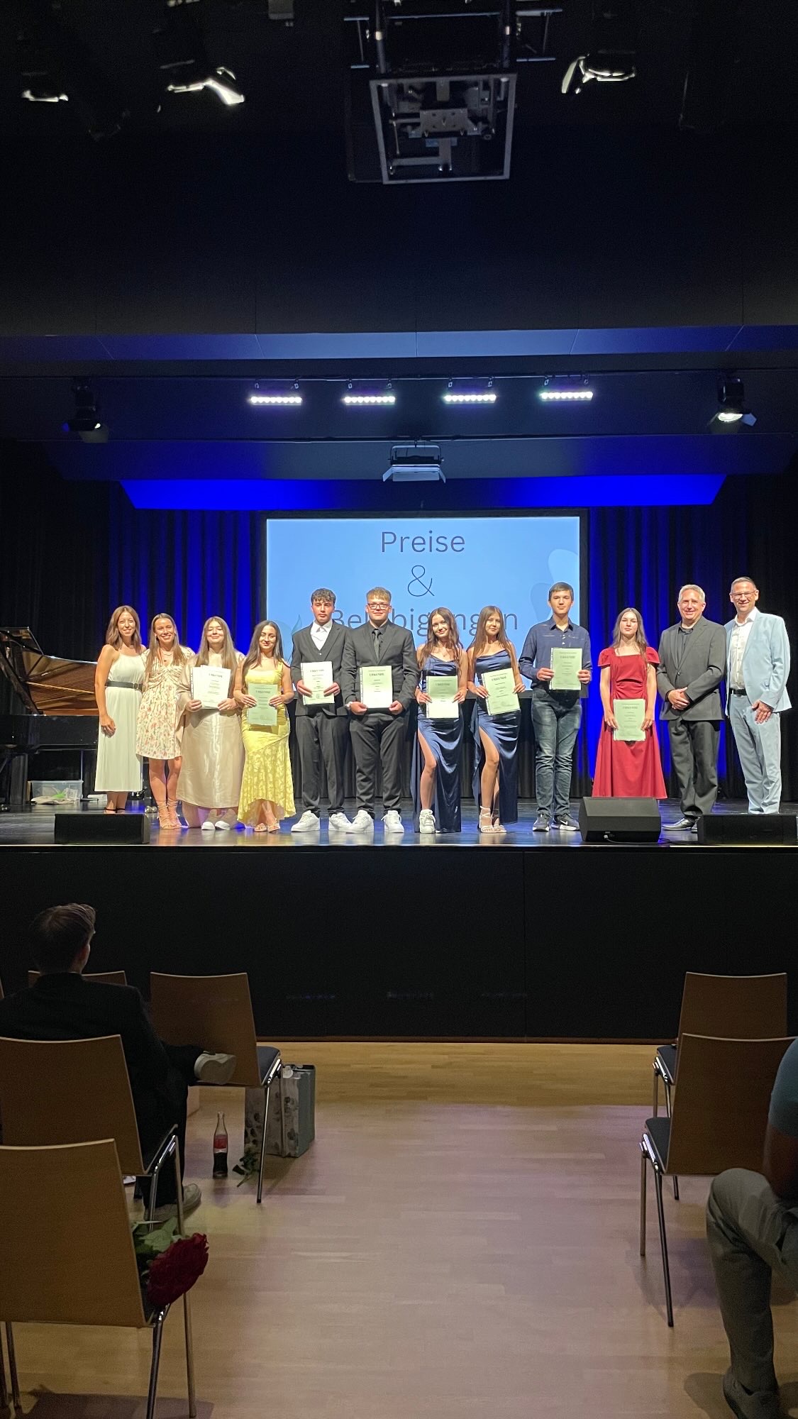 In kleinen Spielen wurde gemeinsam gelacht und ein kreatives (sowie trockenes) „Synchronschwimmen“ sorgte für große Begeisterung und Applaus. In persönlichen Reden kamen Erinnerungen, Dankbarkeit und Zukunftsträume zum Ausdruck. Anschließend wurden die Zeugnisse ausgegeben und eine Vielzahl an Preisen verliehen. Für besondere Leistungen im Rahmen der Hauptschulabschlussprüfung 2025 wurden folgende Schüler:innen geehrt: