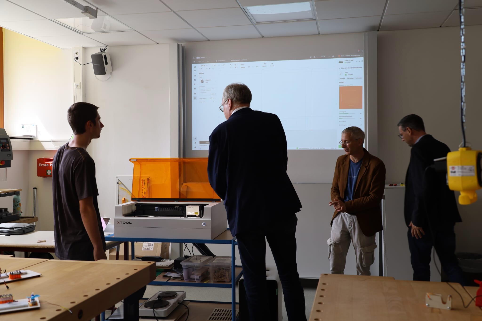 Im Anschluss nahm sich Dr. Schütte Zeit für einen Rundgang durch das Schulgebäude. Rektor Timo Engelhardt stellte dabei auch den neuen Makerspace vor – einen innovativen Lernort mit modernster Ausstattung wie 3D-Druckern und Lasertechnik. Dr. Schütte zeigte sich beeindruckt vom Engagement der Schule, ihren Schülerinnen und Schülern Zukunftstechnologien praktisch und greifbar zu vermitteln.
